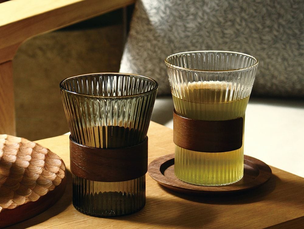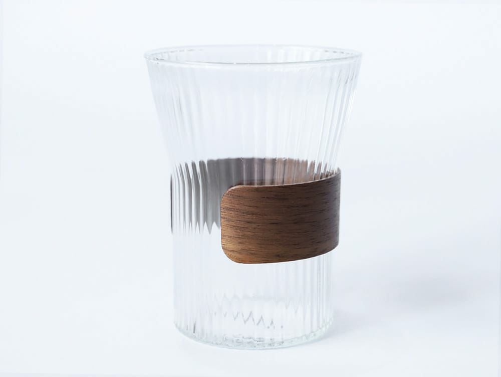 美しいウォルナットの木目と細かくリブが施されキラキラと光るガラスカップの調和をお楽しみ下さい。