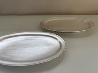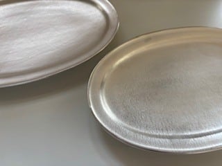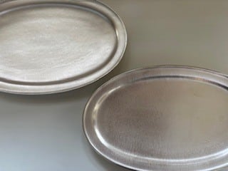 銀彩のうつわは一度本焼きした器に、銀液を塗り700~800度の高温で焼きつけたものです。(上絵焼付)