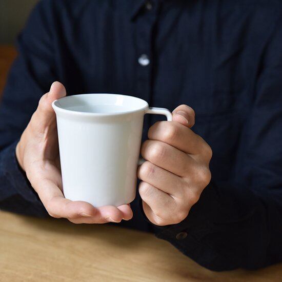 強度のある高密度の陶土を用い、釉薬をかけた艶のあるホワイト、持ち手(ハンドル)付きマグカップです。ハンドル部分はわずかに丸みを帯びて持ちやすくなっています。
