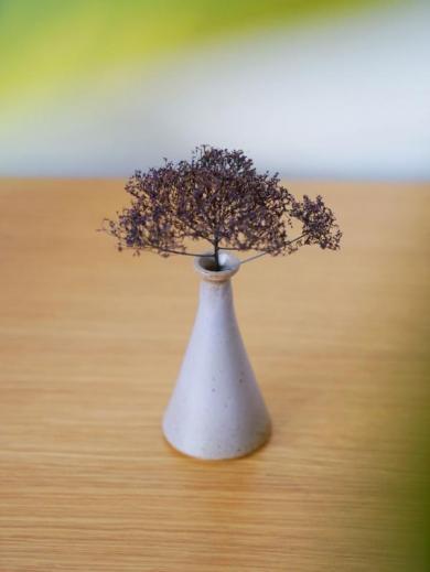 北欧の陶器のようなアンニュイな質感とパープルがかったグレーの色合い、スリムかつ個性的なシルエット。春夏の可憐な花を生けたり、秋冬の実をつける小さな枝ものを生けるのにぴったり一輪挿しです。
